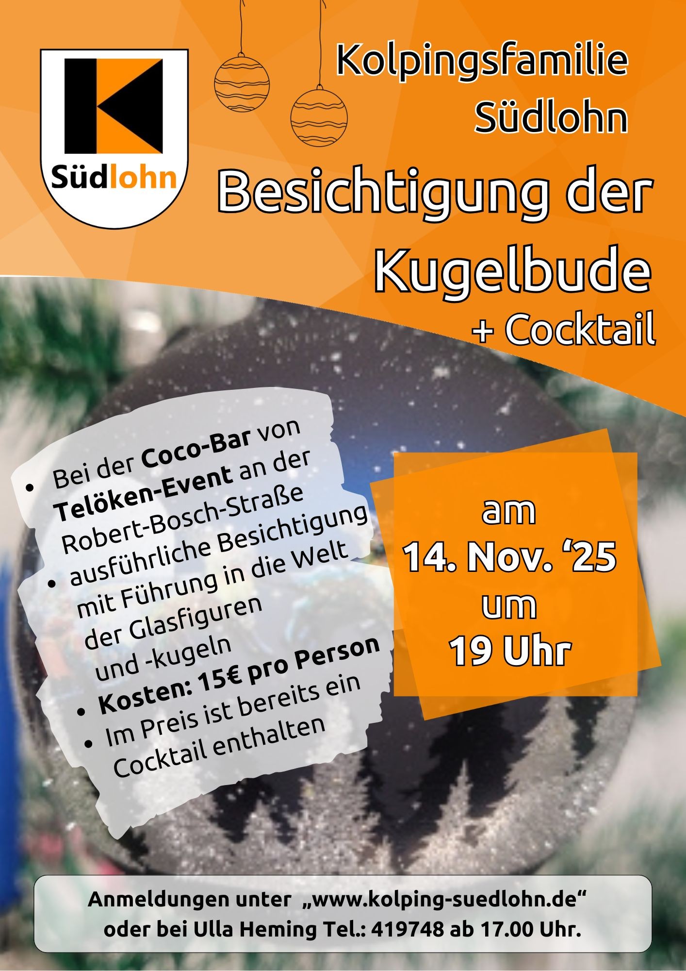 Am Freitag, 14. November war die Kolpingsfamilie Südlohn Gast in der „Kugelbude“ sowie der „Coco Bar“ von Familie Telöken. Die Teilnehmenden erfuhren bei der Führung durch die Ausstellung viel Interessantes und Geschichten über die Weihnachtskugel. Natürlich gab es für jeden Teilnehmenden auch leckere Cocktails, die in geselliger Runde den Abend abrundeten.
